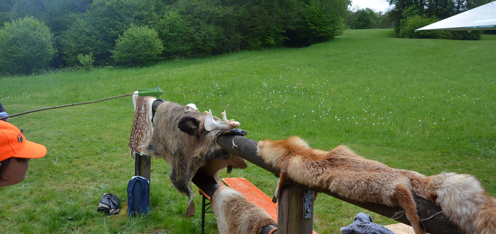 Als wir mit der Führung fertig waren, gingen wir zu einer Hütte. Dort machten wir erst einmal eine Pause. Danach ging es los mit den Stationen. An der ersten Station durften wir auf einen Hochsitz klettern und verschiedene Ferngläser und sogar ein Nachtsichtgerät ausprobieren. An der zweiten Station erfuhren wir viel über Tierspuren und konnten in Fühlkästen erraten, was für ein Teil eines Wildtieres wir fühlen. An der dritten Station bemerkten wir, dass ein Jäger viele Dinge braucht, wenn er auf die Jagd geht. Die vierte Station bestand aus einem großen Anhänger, in dem die Tiere zu sehen waren, die im Wald leben. Man konnte genau erkennen, wo ihr Lebensraum war. Zum Schluss lernten wir sogar einen lebendigen Wanderfalken und einen Habicht kennen. Der Falkner erklärte uns wie diese Vögel jagen.